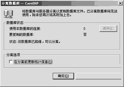 应注意,只有“使用本数据库的连接”数为0时,该数据库才能分离。所以分离数据库时尽量断开所有对要分离数据库操作的连接,如果还有连接数据库的程序,会出现数据库的连接状态窗口,显示正在连接此数据库的机器以及名称,点击清除按钮将从服务器强制断开现有的连接。