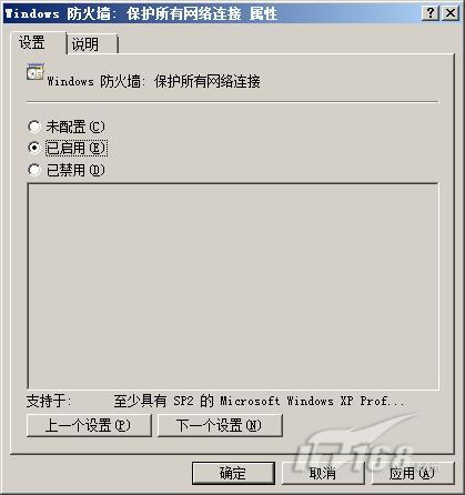 其次将鼠标定位于组策略编辑界面左侧列表区域中的"计算机配置"节点选项上,再从该节点选项下面依次点选"管理模板"、"网络"、"网络连 接"、"Windows防火墙"、"标准配置文件"组策略子项,在目标组策略子项下面,找到"Windows防火墙:保护所有网络连接"选项,并用鼠标双 击该选项,进入如图7所示的选项设置界面;