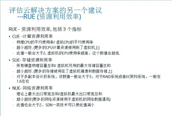 CUE,SUE,NUE这三个指标都是越低越接近1越好,但不可能同时都变低的。其实目前各类方案,归根结底要么是以CPU换硬盘换路由器,要么是 以硬盘以路由器换CPU。就看你自己的成本考量和对于针对用户需求的评估。 一旦基本评估有了,那么三者的不同权重在云建设者或者运营者的心里其实就有了。那么RUE也就基本确定,可以作为一个考核各家方案的相对参考了。当 然,RUE随着云规模的不同也会变化。比如一个100台物理机的私有云云,当其规模变成了200台,那么RUE肯定是会变大的。当然具体变大多少就取决各 个方案的scale能力了。