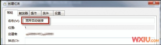2、单击左边的“任务计划程序”并单击右边新出现的“创建任务”选项,打开“创建任务”对话框的“常规”选项卡。