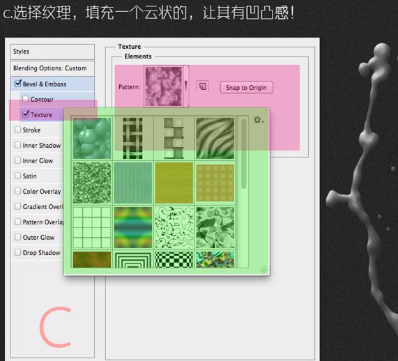 教程制作过程不复杂,不过实际制作的时候还是有一定的难度的首先是飞溅液体的轮廓勾图,需要用钢笔勾出较为复杂的图形然后在添加样式的时候,参数设置要合适,这样做出的质感才自然。