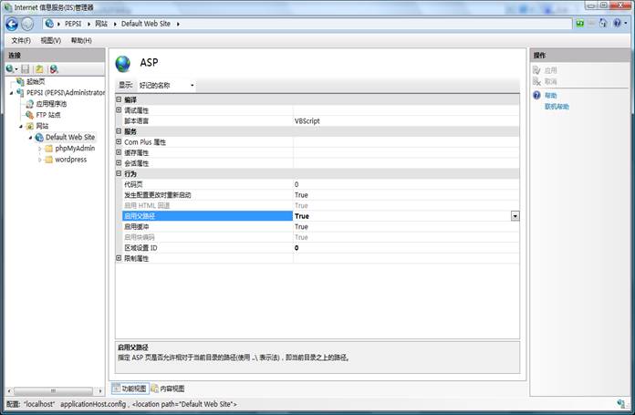 如果你用ASP程序的时候发现程序不能用的话,那么估计就是父路径支持没打开..下图告诉将怎么打开