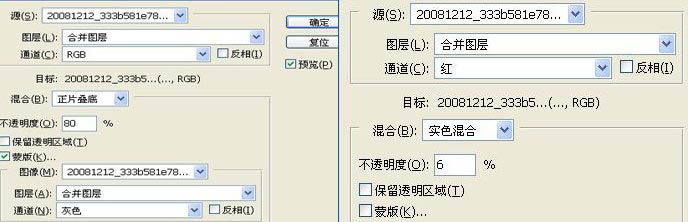 2、执行:图像 》 应用图像,共执行5次,参数设置如下图。确定后用黑色画笔把曝光过度的部分擦出来。