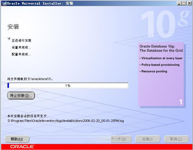 单击“安装”,就会开始安装Oracle DataBase 10g产品了。如图7为安装过程: