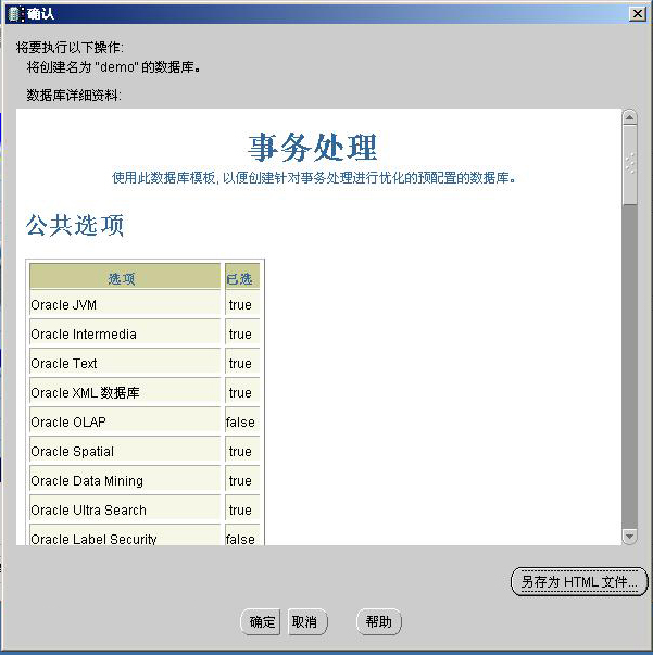 单击“完成”,会显示“确认”对话框,列出了要安装Oracle选项的所有信息。如图15: