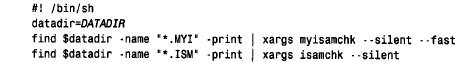 为了运行自动的表检查,可以编写一个脚本,将目录改变为服务器数据目录并对所有数据库表运行myisamchk 和i s a m c h k。我们将在下面讨论的脚本中同时使用这两个程序。如果您只有MyISAM 表或只有ISAM 表,则只需其中一个程序,可以将无关的那个程序从脚本中去除。