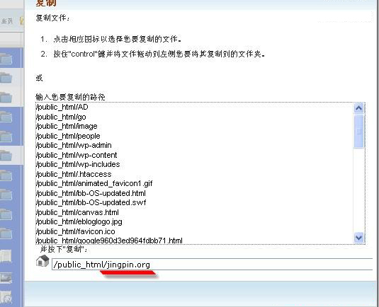 要把原来域名对应的 WordPress 所有文件复制到新域名的空间上,可以点击“文件管理器”,选择原来域名对应的 WordPress 所有文件和文件夹,点击“复制”,然后输入新域名所对应的文件夹路径,点击 “Copy File(s)”。
