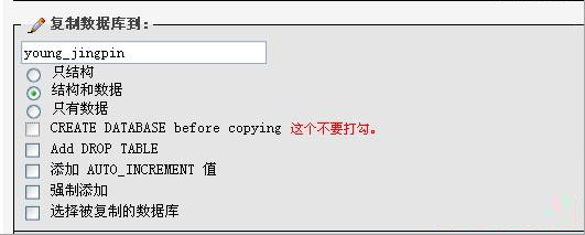 在 cPanel 上点击 phpMyAdmin (中文版 cPanel 翻译成 “phpMy 管理” ),然后选择原来域名的数据库,接着点击“操作”,在“复制数据库到:” 一栏输入新添加的数据库名称(全称,例如 young_jingpin),并取消 “CREATE DATABASE before copying” 前面的勾勾,然后点击“执行”。
