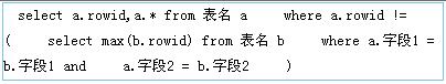 上面的语句非常简单,就是将查询到的数据删除掉。不过这种删除执行的效率非常低,对于大数据量来说,可能会将数据库吊死。所以我建议先将查询到的重复的数据插入到一个临时表中,然后对进行删除,这样,执行删除的时候就不用再进行一次查询了。如下: CREATE TABLE 临时表 AS (select 字段1,字段2,count(*) from 表名 group by 字段1,字段2 having count(*) > 1) 上面这句话就是建立了临时表,并将查询到的数据插入其中。 下面就可以进行这样的删除操作了: delete from 表名 a where 字段1,字段2 in (select 字段1,字段2 from 临时表); 这种先建临时表再进行删除的操作要比直接用一条语句进行删除要高效得多。 这个时候,大家可能会跳出来说,什么?你叫我们执行这种语句,那不是把所有重复的全都删除吗?而我们想保留重复数据中最新的一条记录啊!大家不要急,下面我就讲一下如何进行这种操作。 在oracle中,有个隐藏了自动rowid,里面给每条记录一个唯一的rowid,我们如果想保留最新的一条记录, 我们就可以利用这个字段,保留重复数据中rowid最大的一条记录就可以了。 下面是查询重复数据的一个例子: