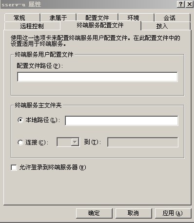 从“终端服务配置文件”选项里取消“允许登录到终端