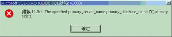 Error 14261: The specified primary_server_name.primary_database_name ('N') already exists.