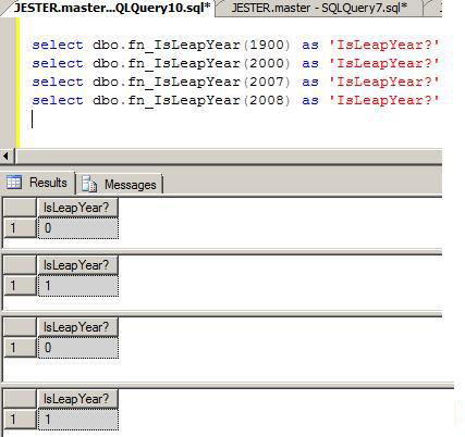 select dbo.fn_IsLeapYear(2007) as 'IsLeapYear?'
