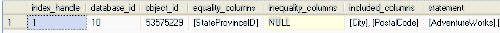 n equality_columns = "StateProvinceID",这是因为这个字段和一个相等运算符在WHERE从句中使用。所以SQL Server告诉我们这将是针对索引的很好的选择。